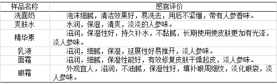 表1 人参系列化妆品的感官评价