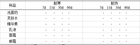 加速稳定性试验:利用恒高温、恒低温和高低温冷热循环,然后恢复室温进行离心,观察结果。分别取洗面奶,精华素,乳液,膏霜适量,放至-20℃~室温,40℃~室温,于第3、7、15、30、90天时,从冰箱或烘箱中拿出恢复室温记录结果。结果显示(表3),人参系列化妆品在超高和超低温条件下长达90天均未出现分层,稳定性良好。