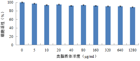 采取磺酰罗丹明B比色法测定人参类脂质体对人真皮成纤维细胞(HDF-a)的细胞活力的影响。结果表明(图12),人参类脂质体浓度范围在5~1280μg/ mL内,与人真皮成纤维细胞孵育24后,细胞存活率仍大于90%,均未显示出细胞毒性,由此证明人参类脂质体用于皮肤是安全可靠的。