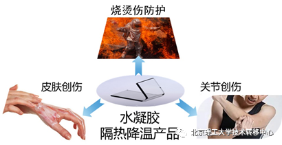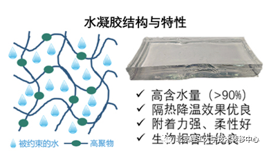 水作为世界上比热最高的材料,是最常用的天然降温材料。但因其强流动性,水难以附着在人体表面,因此难以实现对人的有效防护和及时处理。近年发展起来的水凝胶材料,以三维网络状高分子锁定了大量水分子(含水量高达90%以上),具有与水几乎相同的比热容,同时体现出非常好的粘附性、较好的生物相容性、更低的成本、优异的隔热效果等优点,有望成为新型的高效隔热降温材料。